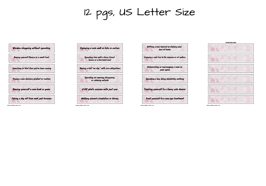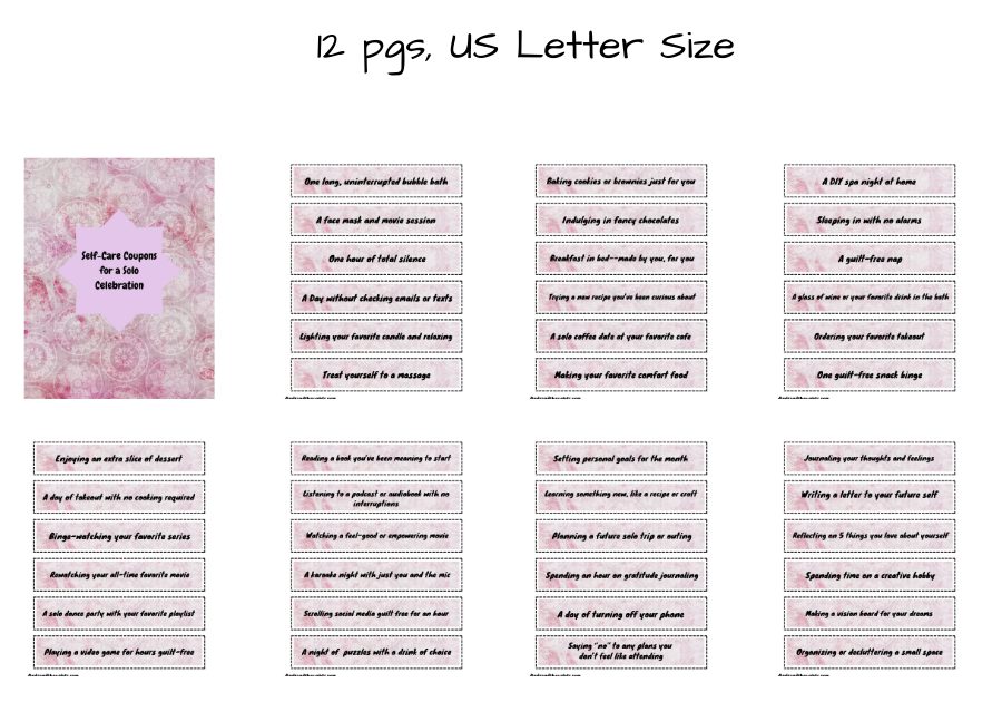 60 Self Care Coupons, with a blank page where you can also create your own. Cut these up in strips, place in a bowl, and draw one or two at a time to start your self-care celebration!!